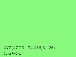 XYZ 47.731,74.466,31.26 Color is a light green color and the nearest color is Light Green #90ee90. Hex code #88f97d and RGB value is rgb(136,249,125). In RGB color space, this color is composed of 53% red, 98% green, 49% blue, In CMYK color space, this color is composed of 45% cyan, 0% magenta, 50% yellow , 2% black , In HSL color space, this color has a hue angle of 115° , 91% saturation and 73% lightness.