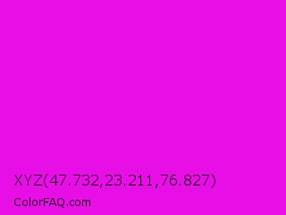 XYZ 47.732,23.211,76.827 Color is a normal magenta color and the nearest color is Phlox #df00ff. Hex code #e80fe6 and RGB value is rgb(232,15,230). In RGB color space, this color is composed of 91% red, 6% green, 90% blue, In CMYK color space, this color is composed of 0% cyan, 94% magenta, 1% yellow , 9% black , In HSL color space, this color has a hue angle of 301° , 88% saturation and 48% lightness.