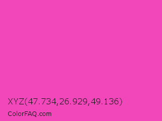 XYZ 47.734,26.929,49.136 Color is a light magenta color and the nearest color is Brilliant Rose #f653a6. Hex code #f247ba and RGB value is rgb(242,71,186). In RGB color space, this color is composed of 95% red, 28% green, 73% blue, In CMYK color space, this color is composed of 0% cyan, 71% magenta, 23% yellow , 5% black , In HSL color space, this color has a hue angle of 320° , 87% saturation and 61% lightness.