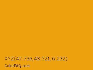 XYZ 47.736,43.521,6.232 Color is a normal orange color and the nearest color is Gamboge #e49b0f. Hex code #eda10c and RGB value is rgb(237,161,12). In RGB color space, this color is composed of 93% red, 63% green, 5% blue, In CMYK color space, this color is composed of 0% cyan, 32% magenta, 95% yellow , 7% black , In HSL color space, this color has a hue angle of 40° , 90% saturation and 49% lightness.