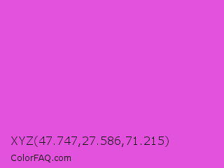 XYZ 47.747,27.586,71.215 Color is a light magenta color and the nearest color is Purple Pizzazz #fe4eda. Hex code #e352dd and RGB value is rgb(227,82,221). In RGB color space, this color is composed of 89% red, 32% green, 87% blue, In CMYK color space, this color is composed of 0% cyan, 64% magenta, 3% yellow , 11% black , In HSL color space, this color has a hue angle of 302° , 72% saturation and 61% lightness.
