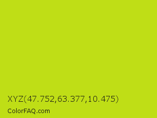 XYZ 47.752,63.377,10.475 Color is a normal yellow color and the nearest color is Fuego #bede0d. Hex code #bfde16 and RGB value is rgb(191,222,22). In RGB color space, this color is composed of 75% red, 87% green, 9% blue, In CMYK color space, this color is composed of 14% cyan, 0% magenta, 90% yellow , 13% black , In HSL color space, this color has a hue angle of 69° , 82% saturation and 48% lightness.