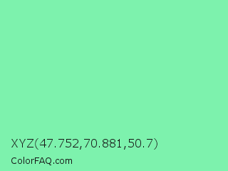 XYZ 47.752,70.881,50.7 Color is a light green color and the nearest color is Teal Deer #99e6b3. Hex code #7df2ad and RGB value is rgb(125,242,173). In RGB color space, this color is composed of 49% red, 95% green, 68% blue, In CMYK color space, this color is composed of 48% cyan, 0% magenta, 29% yellow , 5% black , In HSL color space, this color has a hue angle of 145° , 82% saturation and 72% lightness.