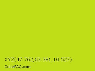 XYZ 47.762,63.381,10.527 Color is a normal yellow color and the nearest color is Fuego #bede0d. Hex code #bfde17 and RGB value is rgb(191,222,23). In RGB color space, this color is composed of 75% red, 87% green, 9% blue, In CMYK color space, this color is composed of 14% cyan, 0% magenta, 90% yellow , 13% black , In HSL color space, this color has a hue angle of 69° , 81% saturation and 48% lightness.