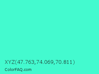 XYZ 47.763,74.069,70.811 Color is a light cyan color and the nearest color is Turquoise #40e0d0. Hex code #43facf and RGB value is rgb(67,250,207). In RGB color space, this color is composed of 26% red, 98% green, 81% blue, In CMYK color space, this color is composed of 73% cyan, 0% magenta, 17% yellow , 2% black , In HSL color space, this color has a hue angle of 166° , 95% saturation and 62% lightness.