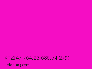 XYZ 47.764,23.686,54.279 Color is a normal magenta color and the nearest color is Shocking Pink #fc0fc0. Hex code #f50dc4 and RGB value is rgb(245,13,196). In RGB color space, this color is composed of 96% red, 5% green, 77% blue, In CMYK color space, this color is composed of 0% cyan, 95% magenta, 20% yellow , 4% black , In HSL color space, this color has a hue angle of 313° , 92% saturation and 51% lightness.