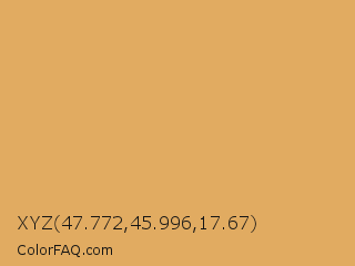 XYZ 47.772,45.996,17.67 Color is a light orange color and the nearest color is Earth Yellow #e1a95f. Hex code #e1ab61 and RGB value is rgb(225,171,97). In RGB color space, this color is composed of 88% red, 67% green, 38% blue, In CMYK color space, this color is composed of 0% cyan, 24% magenta, 57% yellow , 12% black , In HSL color space, this color has a hue angle of 35° , 68% saturation and 63% lightness.