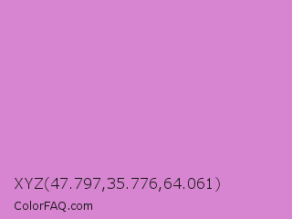 XYZ 47.797,35.776,64.061 Color is a light magenta color and the nearest color is French Mauve #d473d4. Hex code #d785d0 and RGB value is rgb(215,133,208). In RGB color space, this color is composed of 84% red, 52% green, 82% blue, In CMYK color space, this color is composed of 0% cyan, 38% magenta, 3% yellow , 16% black , In HSL color space, this color has a hue angle of 305° , 51% saturation and 68% lightness.