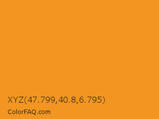XYZ 47.799,40.8,6.795 Color is a normal orange color and the nearest color is Carrot Orange #ed9121. Hex code #f29621 and RGB value is rgb(242,150,33). In RGB color space, this color is composed of 95% red, 59% green, 13% blue, In CMYK color space, this color is composed of 0% cyan, 38% magenta, 86% yellow , 5% black , In HSL color space, this color has a hue angle of 34° , 89% saturation and 54% lightness.