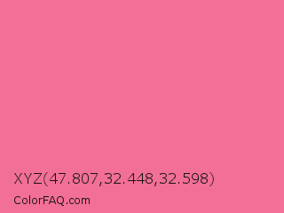 XYZ 47.807,32.448,32.598 Color is a light rose color and the nearest color is Light Crimson #f56991. Hex code #f26f96 and RGB value is rgb(242,111,150). In RGB color space, this color is composed of 95% red, 44% green, 59% blue, In CMYK color space, this color is composed of 0% cyan, 54% magenta, 38% yellow , 5% black , In HSL color space, this color has a hue angle of 342° , 83% saturation and 69% lightness.