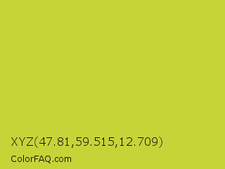 XYZ 47.81,59.515,12.709 Color is a normal yellow color and the nearest color is Pear #d1e231. Hex code #c7d438 and RGB value is rgb(199,212,56). In RGB color space, this color is composed of 78% red, 83% green, 22% blue, In CMYK color space, this color is composed of 6% cyan, 0% magenta, 74% yellow , 17% black , In HSL color space, this color has a hue angle of 65° , 64% saturation and 53% lightness.