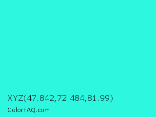 XYZ 47.842,72.484,81.99 Color is a normal cyan color and the nearest color is Turquoise #40e0d0. Hex code #2ef7e0 and RGB value is rgb(46,247,224). In RGB color space, this color is composed of 18% red, 97% green, 88% blue, In CMYK color space, this color is composed of 81% cyan, 0% magenta, 9% yellow , 3% black , In HSL color space, this color has a hue angle of 173° , 93% saturation and 57% lightness.