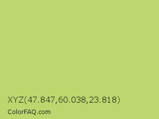 XYZ 47.847,60.038,23.818 Color is a light lime color and the nearest color is Yellow Green #c5e17a. Hex code #bdd66e and RGB value is rgb(189,214,110). In RGB color space, this color is composed of 74% red, 84% green, 43% blue, In CMYK color space, this color is composed of 12% cyan, 0% magenta, 49% yellow , 16% black , In HSL color space, this color has a hue angle of 74° , 56% saturation and 64% lightness.