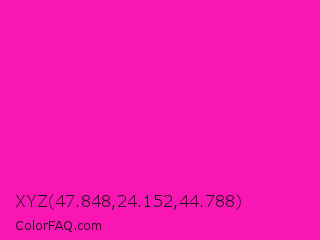 XYZ 47.848,24.152,44.788 Color is a normal magenta color and the nearest color is Shocking Pink #fc0fc0. Hex code #fa16b3 and RGB value is rgb(250,22,179). In RGB color space, this color is composed of 98% red, 9% green, 70% blue, In CMYK color space, this color is composed of 0% cyan, 91% magenta, 28% yellow , 2% black , In HSL color space, this color has a hue angle of 319° , 96% saturation and 53% lightness.