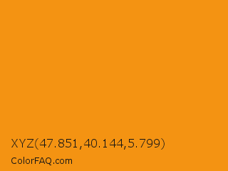 XYZ 47.851,40.144,5.799 Color is a normal orange color and the nearest color is West Side #ff910f. Hex code #f49312 and RGB value is rgb(244,147,18). In RGB color space, this color is composed of 96% red, 58% green, 7% blue, In CMYK color space, this color is composed of 0% cyan, 40% magenta, 93% yellow , 4% black , In HSL color space, this color has a hue angle of 34° , 91% saturation and 51% lightness.