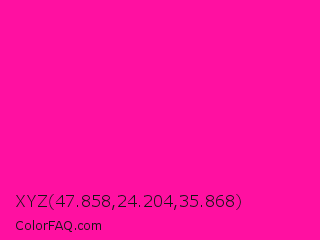 XYZ 47.858,24.204,35.868 Color is a normal magenta color and the nearest color is Fluorescent Pink #ff1493. Hex code #ff10a1 and RGB value is rgb(255,16,161). In RGB color space, this color is composed of 100% red, 6% green, 63% blue, In CMYK color space, this color is composed of 0% cyan, 94% magenta, 37% yellow , 0% black , In HSL color space, this color has a hue angle of 324° , 100% saturation and 53% lightness.
