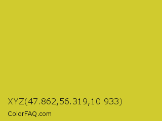 XYZ 47.862,56.319,10.933 Color is a normal yellow color and the nearest color is Key Lime Pie #bfc921. Hex code #d0cb2e and RGB value is rgb(208,203,46). In RGB color space, this color is composed of 82% red, 80% green, 18% blue, In CMYK color space, this color is composed of 0% cyan, 2% magenta, 78% yellow , 18% black , In HSL color space, this color has a hue angle of 58° , 64% saturation and 50% lightness.