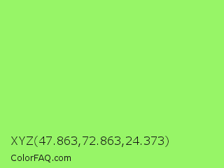 XYZ 47.863,72.863,24.373 Color is a light green color and the nearest color is Inchworm #b2ec5d. Hex code #97f567 and RGB value is rgb(151,245,103). In RGB color space, this color is composed of 59% red, 96% green, 40% blue, In CMYK color space, this color is composed of 38% cyan, 0% magenta, 58% yellow , 4% black , In HSL color space, this color has a hue angle of 100° , 88% saturation and 68% lightness.
