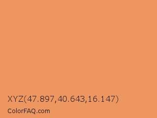 XYZ 47.897,40.643,16.147 Color is a light orange color and the nearest color is Big Foot Feet #e88e5a. Hex code #ed965f and RGB value is rgb(237,150,95). In RGB color space, this color is composed of 93% red, 59% green, 37% blue, In CMYK color space, this color is composed of 0% cyan, 37% magenta, 60% yellow , 7% black , In HSL color space, this color has a hue angle of 23° , 80% saturation and 65% lightness.