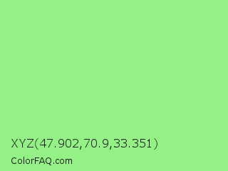 XYZ 47.902,70.9,33.351 Color is a light green color and the nearest color is Light Green #90ee90. Hex code #94f185 and RGB value is rgb(148,241,133). In RGB color space, this color is composed of 58% red, 95% green, 52% blue, In CMYK color space, this color is composed of 39% cyan, 0% magenta, 45% yellow , 5% black , In HSL color space, this color has a hue angle of 112° , 79% saturation and 73% lightness.