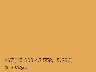XYZ 47.903,45.558,15.286 Color is a light orange color and the nearest color is Indian Yellow #e3a857. Hex code #e4a957 and RGB value is rgb(228,169,87). In RGB color space, this color is composed of 89% red, 66% green, 34% blue, In CMYK color space, this color is composed of 0% cyan, 26% magenta, 62% yellow , 11% black , In HSL color space, this color has a hue angle of 35° , 72% saturation and 62% lightness.