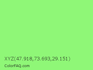 XYZ 47.918,73.693,29.151 Color is a light green color and the nearest color is Light Green #90ee90. Hex code #8ff777 and RGB value is rgb(143,247,119). In RGB color space, this color is composed of 56% red, 97% green, 47% blue, In CMYK color space, this color is composed of 42% cyan, 0% magenta, 52% yellow , 3% black , In HSL color space, this color has a hue angle of 109° , 89% saturation and 72% lightness.
