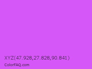 XYZ 47.928,27.828,90.841 Color is a light purple color and the nearest color is Heliotrope #df73ff. Hex code #d657f7 and RGB value is rgb(214,87,247). In RGB color space, this color is composed of 84% red, 34% green, 97% blue, In CMYK color space, this color is composed of 13% cyan, 65% magenta, 0% yellow , 3% black , In HSL color space, this color has a hue angle of 288° , 91% saturation and 65% lightness.