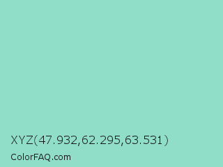 XYZ 47.932,62.295,63.531 Color is a light green color and the nearest color is Middle Blue Green #8dd9cc. Hex code #90dec7 and RGB value is rgb(144,222,199). In RGB color space, this color is composed of 56% red, 87% green, 78% blue, In CMYK color space, this color is composed of 35% cyan, 0% magenta, 10% yellow , 13% black , In HSL color space, this color has a hue angle of 162° , 54% saturation and 72% lightness.