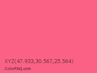 XYZ 47.933,30.567,25.564 Color is a light red color and the nearest color is Brink Pink #fb607f. Hex code #fa6185 and RGB value is rgb(250,97,133). In RGB color space, this color is composed of 98% red, 38% green, 52% blue, In CMYK color space, this color is composed of 0% cyan, 61% magenta, 47% yellow , 2% black , In HSL color space, this color has a hue angle of 346° , 94% saturation and 68% lightness.