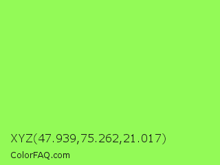 XYZ 47.939,75.262,21.017 Color is a light green color and the nearest color is Kiwi #8ee53f. Hex code #93fa57 and RGB value is rgb(147,250,87). In RGB color space, this color is composed of 58% red, 98% green, 34% blue, In CMYK color space, this color is composed of 41% cyan, 0% magenta, 65% yellow , 2% black , In HSL color space, this color has a hue angle of 98° , 94% saturation and 66% lightness.