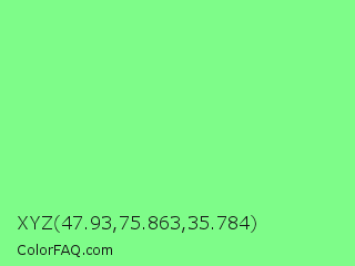 XYZ 47.93,75.863,35.784 Color is a light green color and the nearest color is Light Green #90ee90. Hex code #7efc89 and RGB value is rgb(126,252,137). In RGB color space, this color is composed of 49% red, 99% green, 54% blue, In CMYK color space, this color is composed of 50% cyan, 0% magenta, 46% yellow , 1% black , In HSL color space, this color has a hue angle of 125° , 95% saturation and 74% lightness.