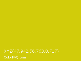 XYZ 47.942,56.763,8.717 Color is a normal yellow color and the nearest color is Bird Flower #d4cd16. Hex code #d1cc0a and RGB value is rgb(209,204,10). In RGB color space, this color is composed of 82% red, 80% green, 4% blue, In CMYK color space, this color is composed of 0% cyan, 2% magenta, 95% yellow , 18% black , In HSL color space, this color has a hue angle of 58° , 91% saturation and 43% lightness.