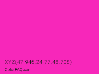 XYZ 47.946,24.77,48.708 Color is a normal magenta color and the nearest color is Razzle Dazzle Rose #ff33cc. Hex code #f727ba and RGB value is rgb(247,39,186). In RGB color space, this color is composed of 97% red, 15% green, 73% blue, In CMYK color space, this color is composed of 0% cyan, 84% magenta, 25% yellow , 3% black , In HSL color space, this color has a hue angle of 318° , 93% saturation and 56% lightness.