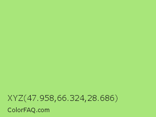 XYZ 47.958,66.324,28.686 Color is a light green color and the nearest color is Feijoa #9fdd8c. Hex code #a8e67a and RGB value is rgb(168,230,122). In RGB color space, this color is composed of 66% red, 90% green, 48% blue, In CMYK color space, this color is composed of 27% cyan, 0% magenta, 47% yellow , 10% black , In HSL color space, this color has a hue angle of 94° , 68% saturation and 69% lightness.