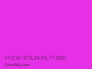 XYZ 47.973,24.65,77.092 Color is a normal magenta color and the nearest color is Razzle Dazzle Rose #ff33cc. Hex code #e630e6 and RGB value is rgb(230,48,230). In RGB color space, this color is composed of 90% red, 19% green, 90% blue, In CMYK color space, this color is composed of 0% cyan, 79% magenta, 0% yellow , 10% black , In HSL color space, this color has a hue angle of 300° , 78% saturation and 55% lightness.