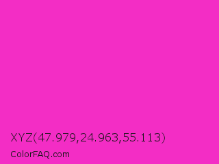 XYZ 47.979,24.963,55.113 Color is a normal magenta color and the nearest color is Razzle Dazzle Rose #ff33cc. Hex code #f32dc5 and RGB value is rgb(243,45,197). In RGB color space, this color is composed of 95% red, 18% green, 77% blue, In CMYK color space, this color is composed of 0% cyan, 81% magenta, 19% yellow , 5% black , In HSL color space, this color has a hue angle of 314° , 89% saturation and 56% lightness.