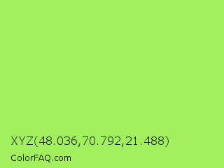 XYZ 48.036,70.792,21.488 Color is a light green color and the nearest color is Inchworm #b2ec5d. Hex code #a2f05d and RGB value is rgb(162,240,93). In RGB color space, this color is composed of 64% red, 94% green, 36% blue, In CMYK color space, this color is composed of 33% cyan, 0% magenta, 61% yellow , 6% black , In HSL color space, this color has a hue angle of 92° , 83% saturation and 65% lightness.