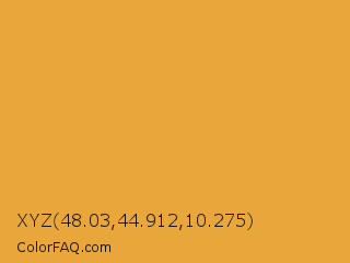 XYZ 48.03,44.912,10.275 Color is a normal orange color and the nearest color is Tulip Tree #eab33b. Hex code #e9a63b and RGB value is rgb(233,166,59). In RGB color space, this color is composed of 91% red, 65% green, 23% blue, In CMYK color space, this color is composed of 0% cyan, 29% magenta, 75% yellow , 9% black , In HSL color space, this color has a hue angle of 37° , 80% saturation and 57% lightness.