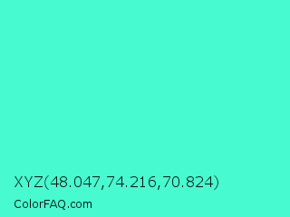 XYZ 48.047,74.216,70.824 Color is a light cyan color and the nearest color is Turquoise #40e0d0. Hex code #47facf and RGB value is rgb(71,250,207). In RGB color space, this color is composed of 28% red, 98% green, 81% blue, In CMYK color space, this color is composed of 72% cyan, 0% magenta, 17% yellow , 2% black , In HSL color space, this color has a hue angle of 166° , 95% saturation and 63% lightness.