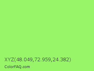 XYZ 48.049,72.959,24.382 Color is a light green color and the nearest color is Inchworm #b2ec5d. Hex code #98f567 and RGB value is rgb(152,245,103). In RGB color space, this color is composed of 60% red, 96% green, 40% blue, In CMYK color space, this color is composed of 38% cyan, 0% magenta, 58% yellow , 4% black , In HSL color space, this color has a hue angle of 99° , 88% saturation and 68% lightness.
