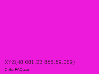XYZ 48.081,23.858,69.089 Color is a normal magenta color and the nearest color is Hot Magenta #ff1dce. Hex code #ed1adb and RGB value is rgb(237,26,219). In RGB color space, this color is composed of 93% red, 10% green, 86% blue, In CMYK color space, this color is composed of 0% cyan, 89% magenta, 8% yellow , 7% black , In HSL color space, this color has a hue angle of 305° , 85% saturation and 52% lightness.