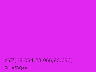 XYZ 48.084,23.966,86.096 Color is a normal magenta color and the nearest color is Phlox #df00ff. Hex code #e226f2 and RGB value is rgb(226,38,242). In RGB color space, this color is composed of 89% red, 15% green, 95% blue, In CMYK color space, this color is composed of 7% cyan, 84% magenta, 0% yellow , 5% black , In HSL color space, this color has a hue angle of 295° , 89% saturation and 55% lightness.