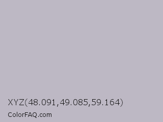 XYZ 48.091,49.085,59.164 Color is a light violet color and the nearest color is French Gray #bdbdc6. Hex code #bdb8c4 and RGB value is rgb(189,184,196). In RGB color space, this color is composed of 74% red, 72% green, 77% blue, In CMYK color space, this color is composed of 4% cyan, 6% magenta, 0% yellow , 23% black , In HSL color space, this color has a hue angle of 265° , 9% saturation and 75% lightness.