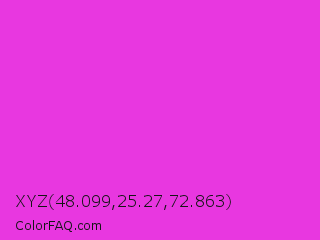 XYZ 48.099,25.27,72.863 Color is a normal magenta color and the nearest color is Razzle Dazzle Rose #ff33cc. Hex code #e837e0 and RGB value is rgb(232,55,224). In RGB color space, this color is composed of 91% red, 22% green, 88% blue, In CMYK color space, this color is composed of 0% cyan, 76% magenta, 3% yellow , 9% black , In HSL color space, this color has a hue angle of 303° , 79% saturation and 56% lightness.