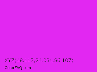 XYZ 48.117,24.031,86.107 Color is a normal magenta color and the nearest color is Phlox #df00ff. Hex code #e227f2 and RGB value is rgb(226,39,242). In RGB color space, this color is composed of 89% red, 15% green, 95% blue, In CMYK color space, this color is composed of 7% cyan, 84% magenta, 0% yellow , 5% black , In HSL color space, this color has a hue angle of 295° , 89% saturation and 55% lightness.