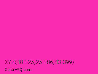 XYZ 48.125,25.186,43.399 Color is a normal magenta color and the nearest color is Persian Rose #fe28a2. Hex code #fa2bb0 and RGB value is rgb(250,43,176). In RGB color space, this color is composed of 98% red, 17% green, 69% blue, In CMYK color space, this color is composed of 0% cyan, 83% magenta, 30% yellow , 2% black , In HSL color space, this color has a hue angle of 321° , 95% saturation and 57% lightness.