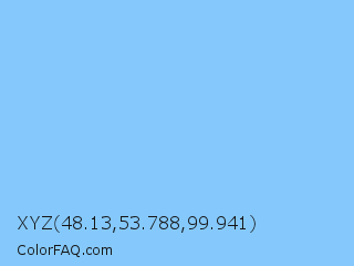XYZ 48.13,53.788,99.941 Color is a light blue color and the nearest color is Light Sky Blue #87cefa. Hex code #85c9fc and RGB value is rgb(133,201,252). In RGB color space, this color is composed of 52% red, 79% green, 99% blue, In CMYK color space, this color is composed of 47% cyan, 20% magenta, 0% yellow , 1% black , In HSL color space, this color has a hue angle of 206° , 95% saturation and 75% lightness.