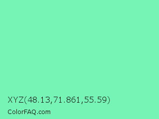 XYZ 48.13,71.861,55.59 Color is a light green color and the nearest color is Medium Aquamarine #66ddaa. Hex code #75f4b6 and RGB value is rgb(117,244,182). In RGB color space, this color is composed of 46% red, 96% green, 71% blue, In CMYK color space, this color is composed of 52% cyan, 0% magenta, 25% yellow , 4% black , In HSL color space, this color has a hue angle of 151° , 85% saturation and 71% lightness.