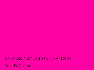 XYZ 48.145,24.057,38.182 Color is a normal magenta color and the nearest color is Hollywood Cerise #f400a1. Hex code #ff02a6 and RGB value is rgb(255,2,166). In RGB color space, this color is composed of 100% red, 1% green, 65% blue, In CMYK color space, this color is composed of 0% cyan, 99% magenta, 35% yellow , 0% black , In HSL color space, this color has a hue angle of 321° , 100% saturation and 50% lightness.