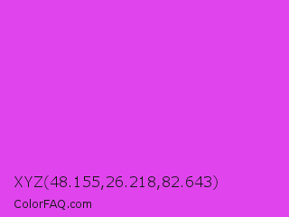 XYZ 48.155,26.218,82.643 Color is a normal magenta color and the nearest color is Purple Pizzazz #fe4eda. Hex code #e045ed and RGB value is rgb(224,69,237). In RGB color space, this color is composed of 88% red, 27% green, 93% blue, In CMYK color space, this color is composed of 5% cyan, 71% magenta, 0% yellow , 7% black , In HSL color space, this color has a hue angle of 295° , 82% saturation and 60% lightness.